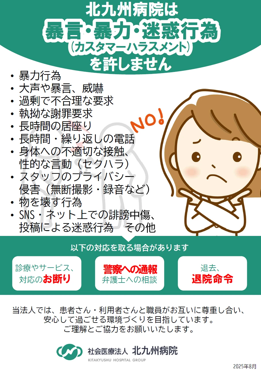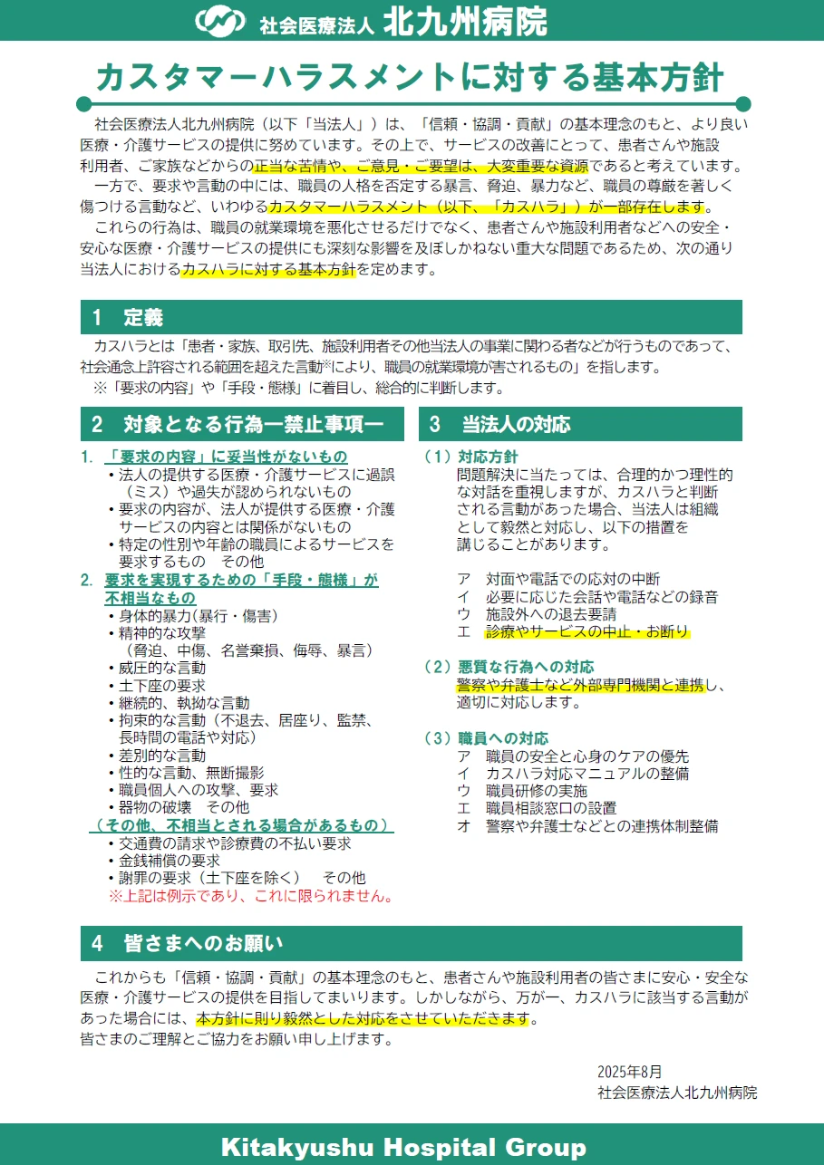 このたび、患者さま・ご家族、ならびにその他の施設利用者の皆さまに、安心してご利用いただける環境を守るため、当法人では「カスタマーハラスメント(施設利用者等による暴言・暴力・著しい迷惑行為)」に関する基本方針