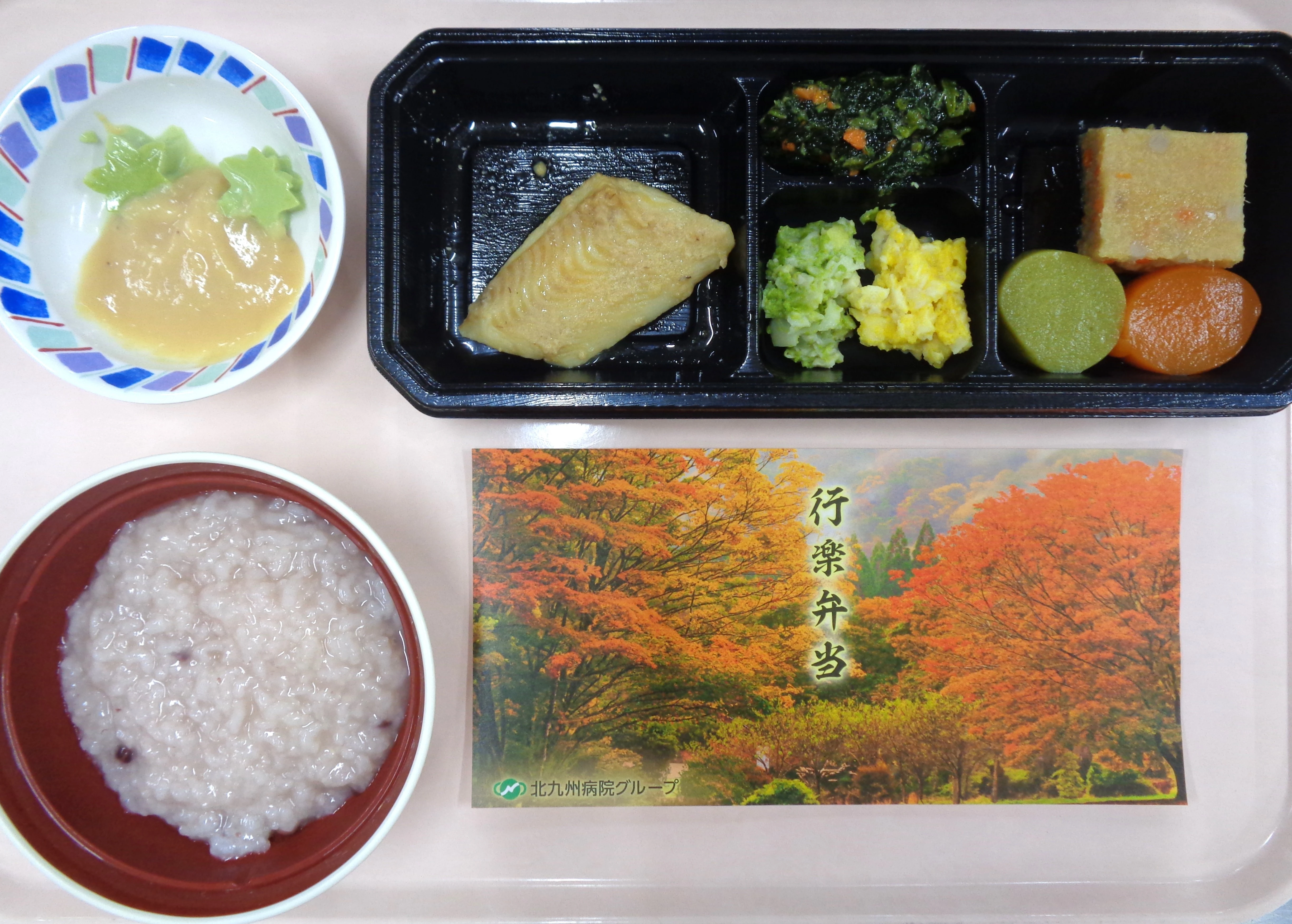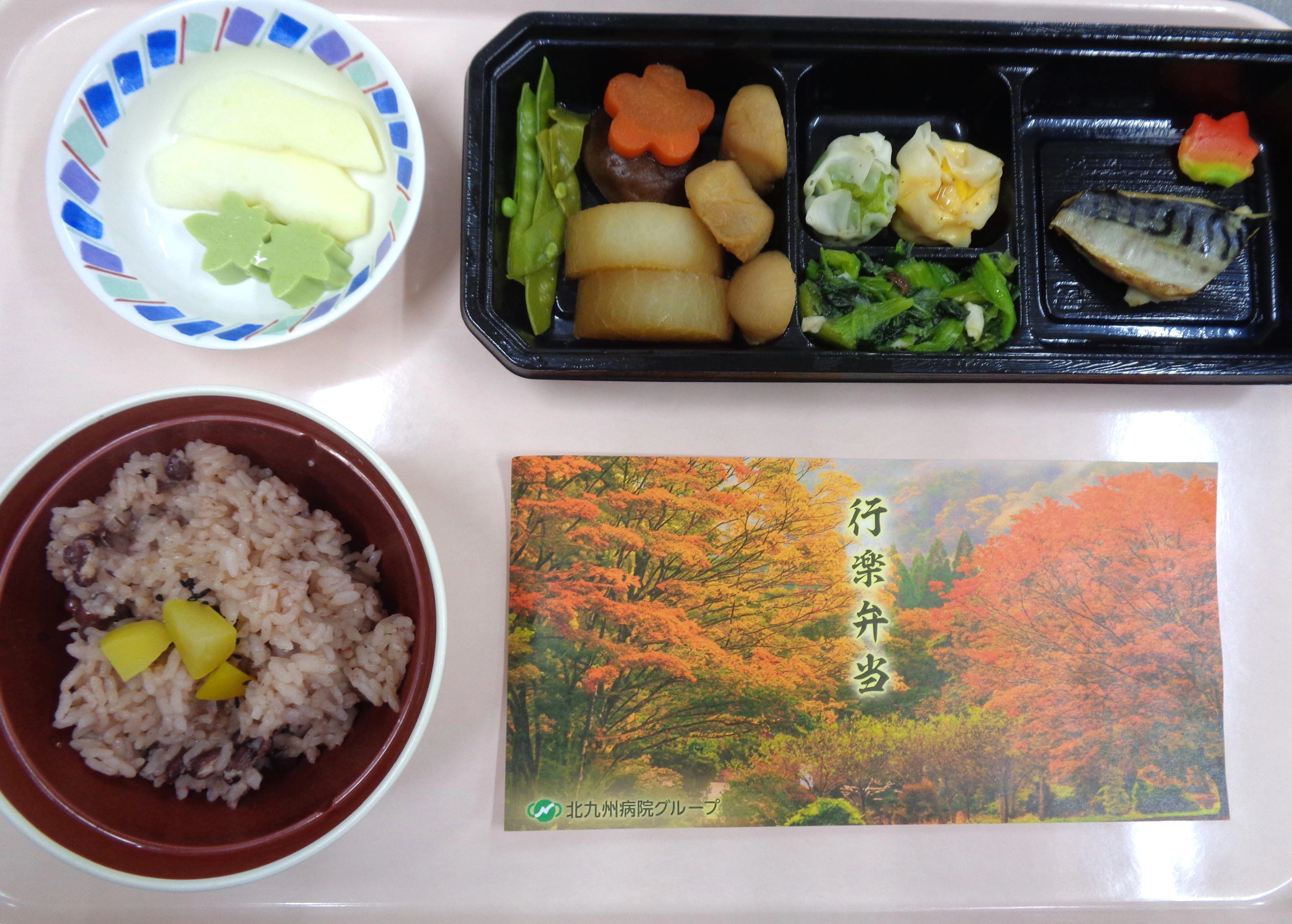 【常食】 ・赤飯 ・西京焼き ・野菜しゅうまい ・がめ煮 ・青梗菜の梅和え ・抹茶ゼリー&りんご 【粥ケア食】 ・小豆粥 ・西京焼き ・野菜しゅうまい ・煮物 ・ほうれん草の梅和え ・抹茶ゼリー